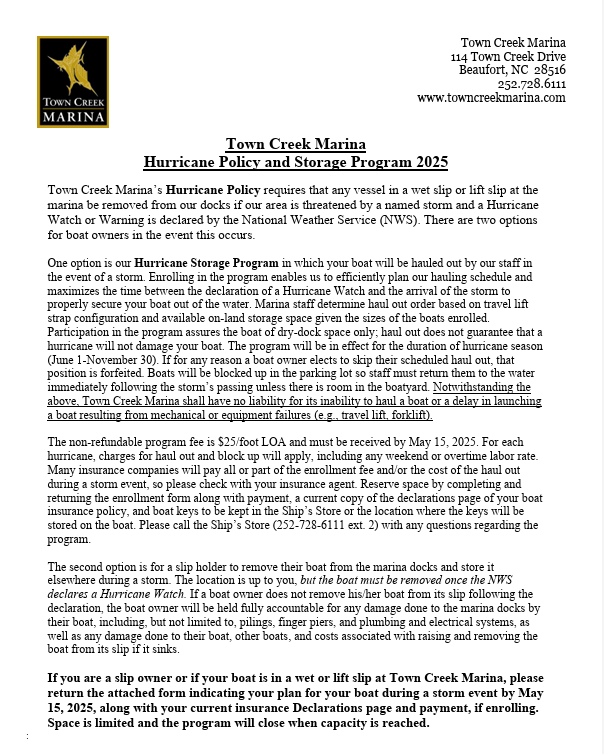 Town Creek Marina’s Hurricane Policy requires that all boats must be evacuated from our slips if a Hurricane Watch or Hurricane Warning is declared for Carteret County by the National Weather Service and we will begin hauling boats at that time. As vessels are stored in our boat yard as well as the parking lot, dry dock space is limited. Boat owners electing not to participate in the program must remove their boats at this time as well.